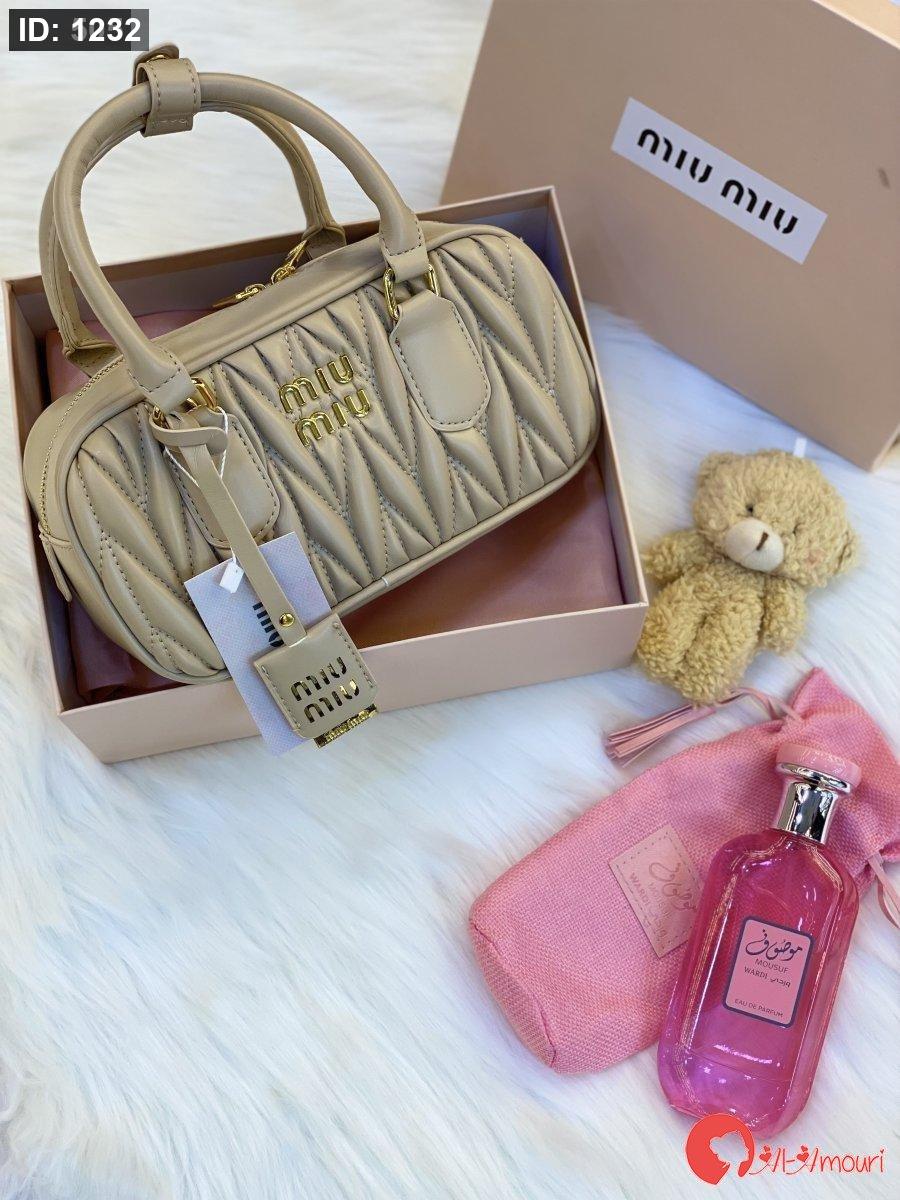 حقيبة ميو ميو قاعدة 22 سم لون بيج مع علبه