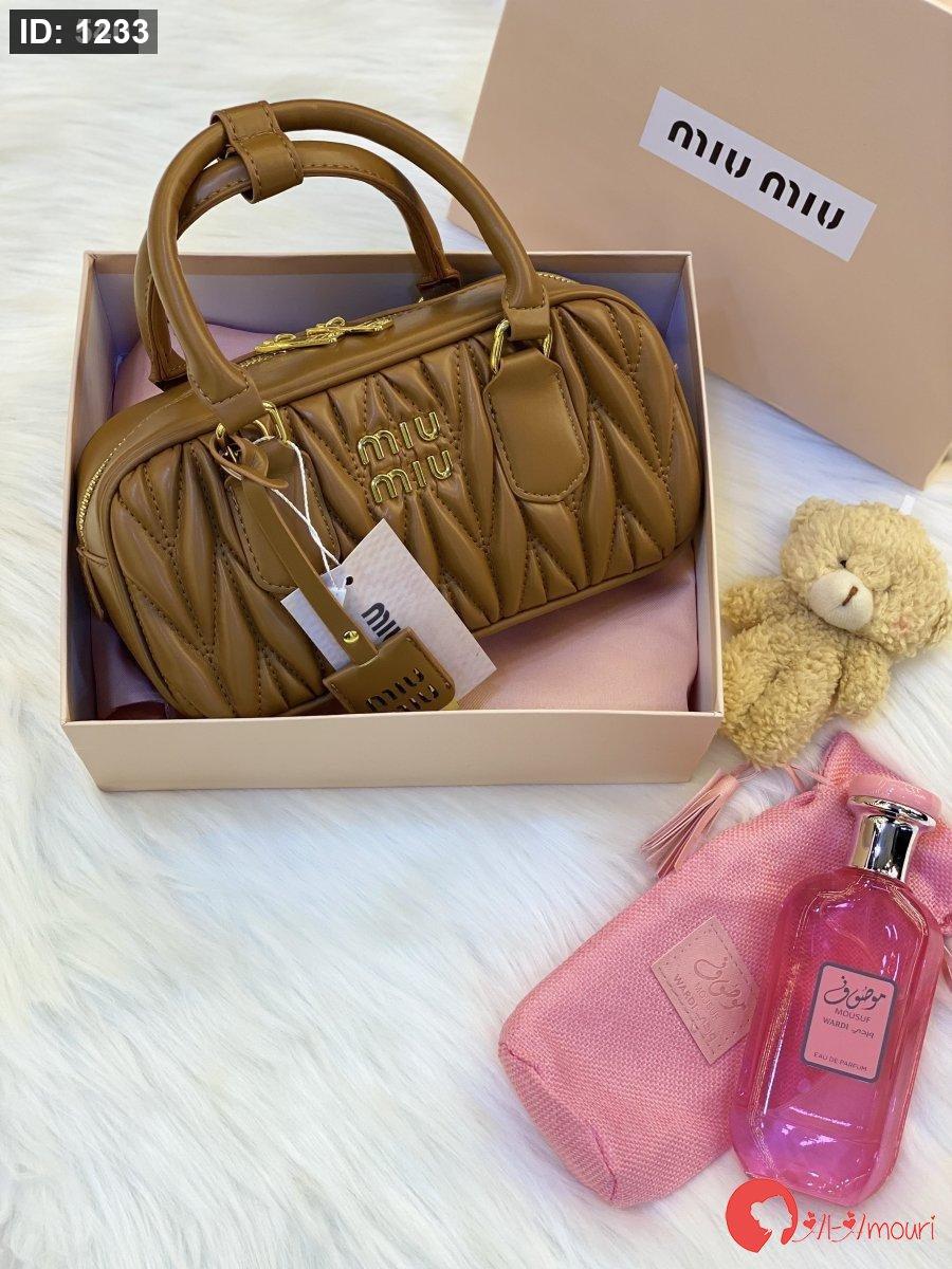 شنطة ميو ميو قاعده 22 سم بلون العسلي مع علبه